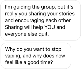 Meet everyone in your group, get to know their stories and your guide. Then, reflect on the role vaping (and quitting) plays in your life, which helps keep you motivated to quit.